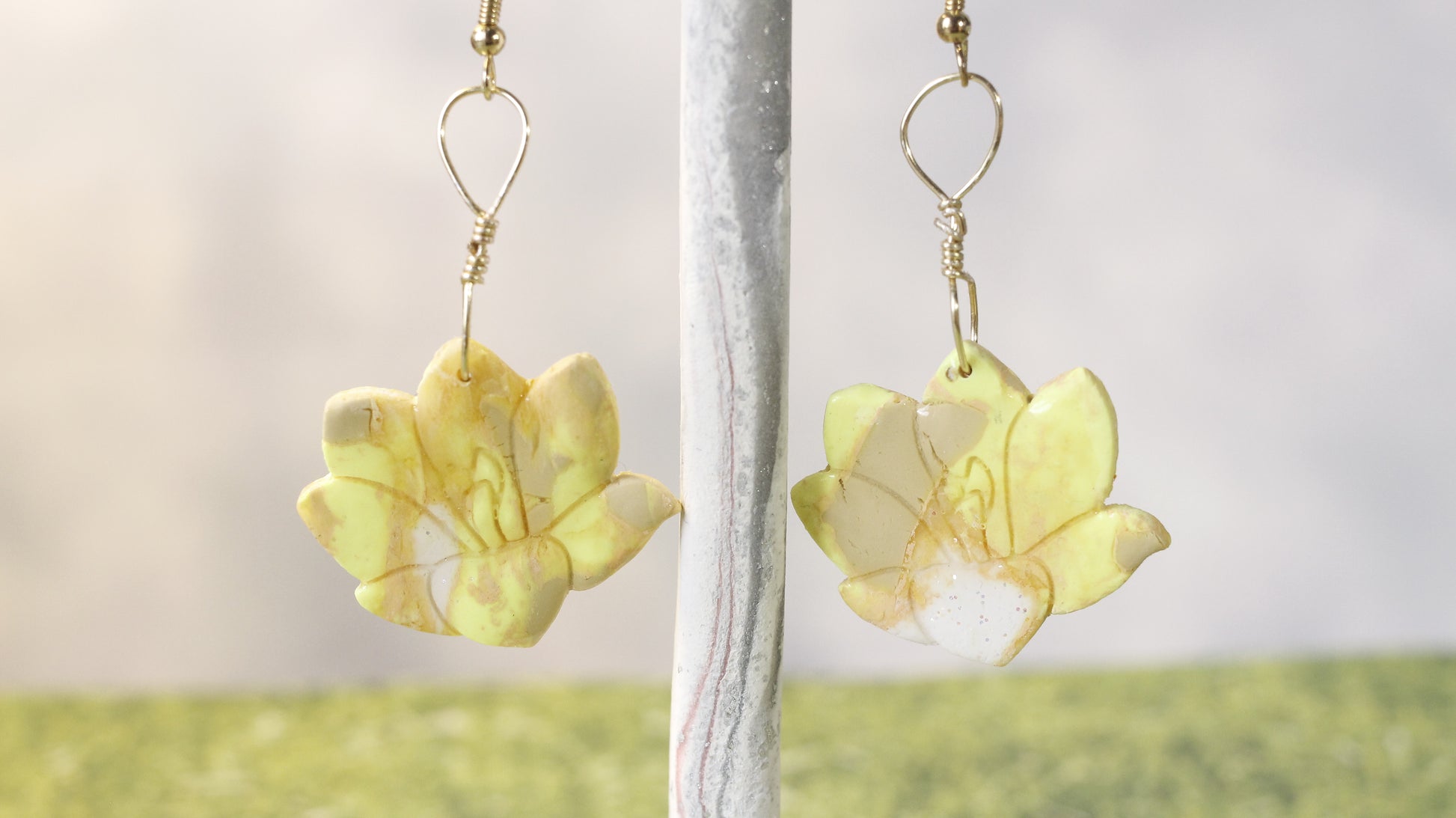Vibrant and gorgeous crocus floral-cut clay earrings. Resin-coated for a sleek, shiny finish. Earring hooks are gold-plated and come with rubber backing.